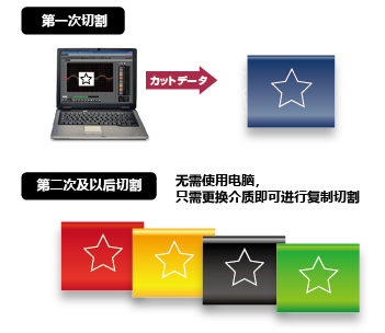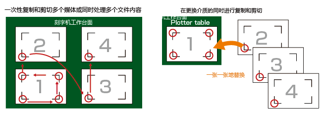 当从电脑向切割绘图仪发送切割数据并完成一次切割输出后,切割绘图仪可以利用缓冲内存中保存的切割数据,通过本机操作面板执行复制切割。