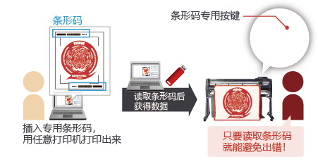 在需要切割的介质上打印专用条码,通过读取该条码,可以自动从电脑(Data Link Server)或 USB 存储器中获取对应的切割数据并执行切割。