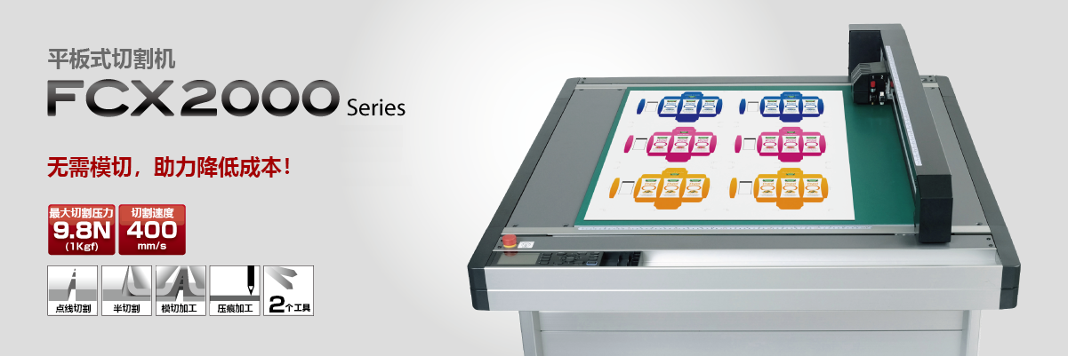 FCX2000 series,为刚性材料的包装打样和小批量生产提供完美解决方案,无需切割模具。其刚性、动力和传动系统已得到改进,实现更精确的切割。配备了先进的注册标记识别系统(ARMS),通过多种功能提高生产效率。此外,还配备了紧急停止按钮以确保安全。